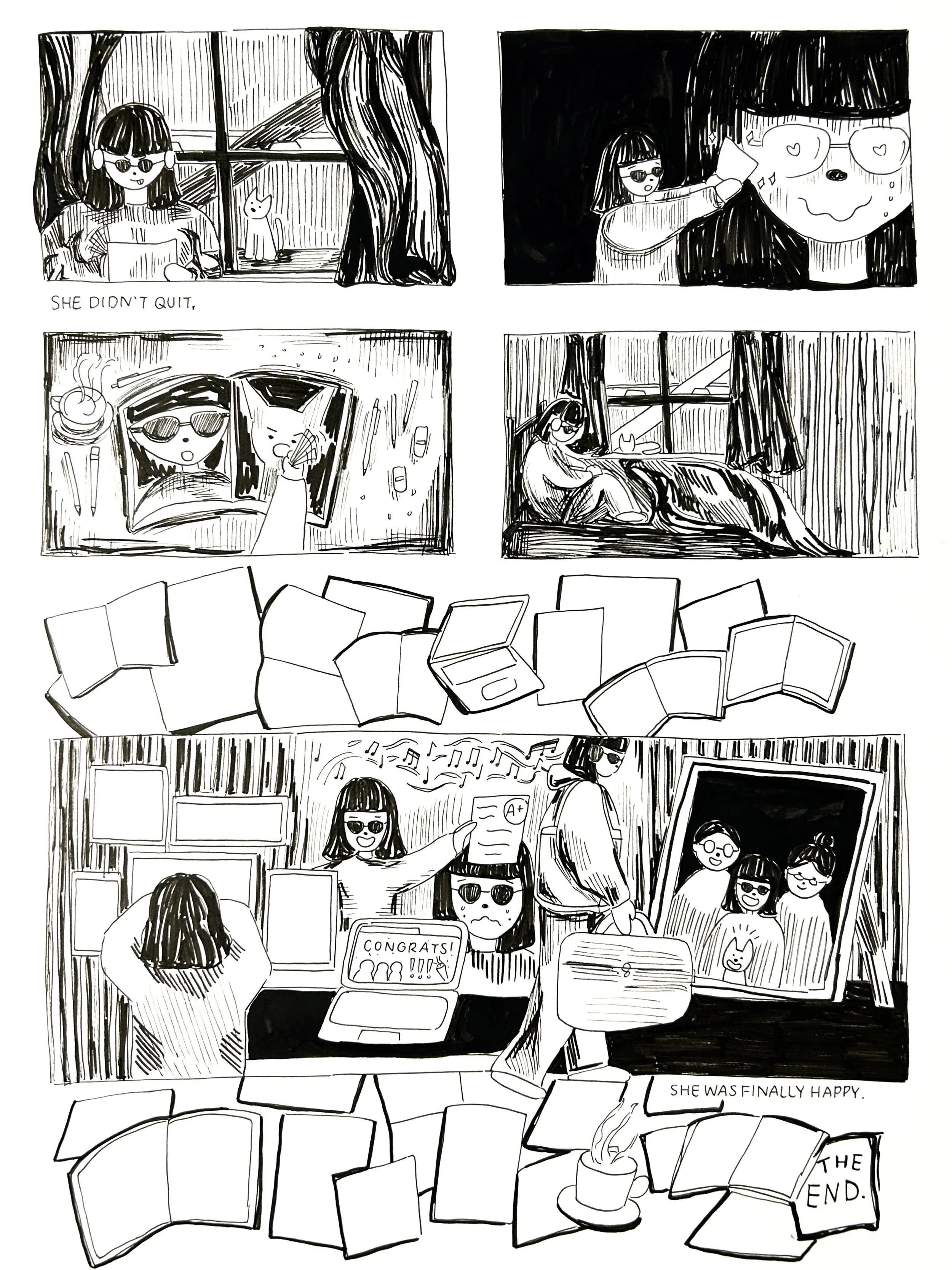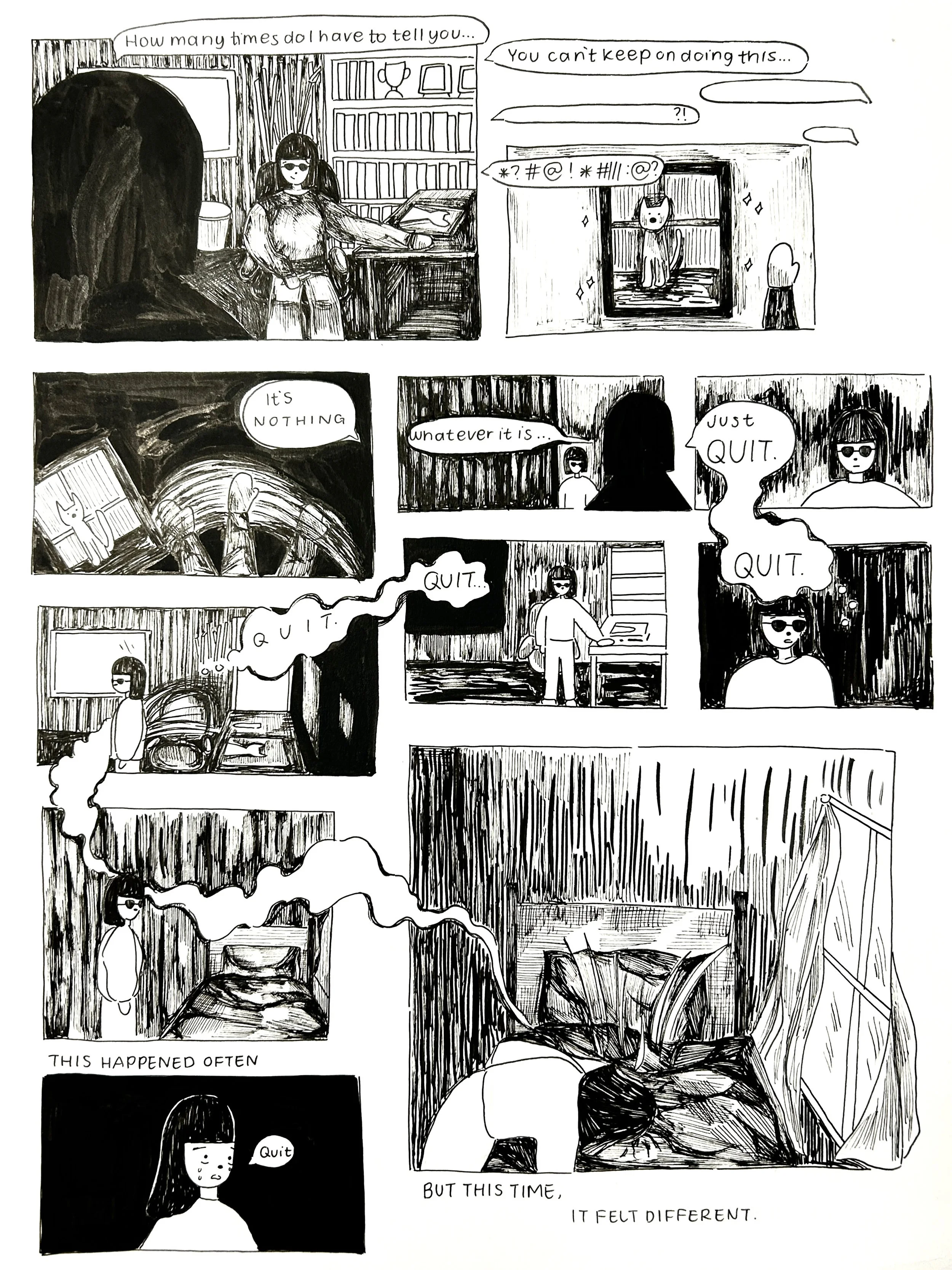 Using pens and brushes with India ink to create my own comics and visuals. Pen & Ink